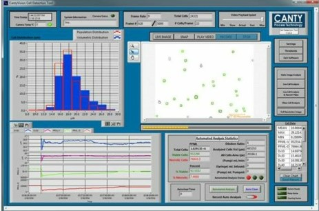 CantyVision细胞分析软件连同注射泵和蠕动泵自动稀释浓缩细胞到适当的最佳成像密度,然后此软件根据细胞的数量和稀释缓冲液的容量计算出稀释比。通过自动稀释样品,发现在每毫升30 x 10^6的细胞密度测试中细胞没有达到饱和点。