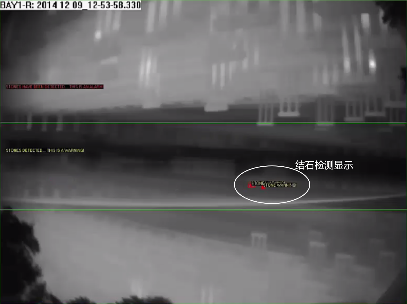 视频图像中部的绿色方框即为用户定义的测量区域,一旦检测到结石(如视频所示检测到两个结石),除将在图像上显示结石提醒之外,软件将持续显示报警30s。另外,VCM还可以通过OPC、4-20mA或Modbus TCP/IP自动发送报警信号到用户控制系统,暂时提高涂层器位置,直到异物从下方通过后,再恢复正常生产。
