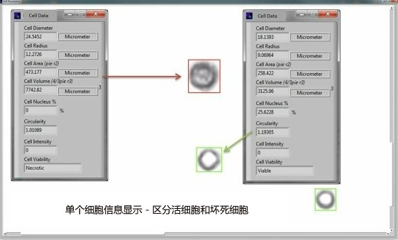 CantyVision软件能够利用细胞亮度、细胞核面积和圆度,来判定细胞活性,如下图显示细胞活性和单个细胞的详细信息。