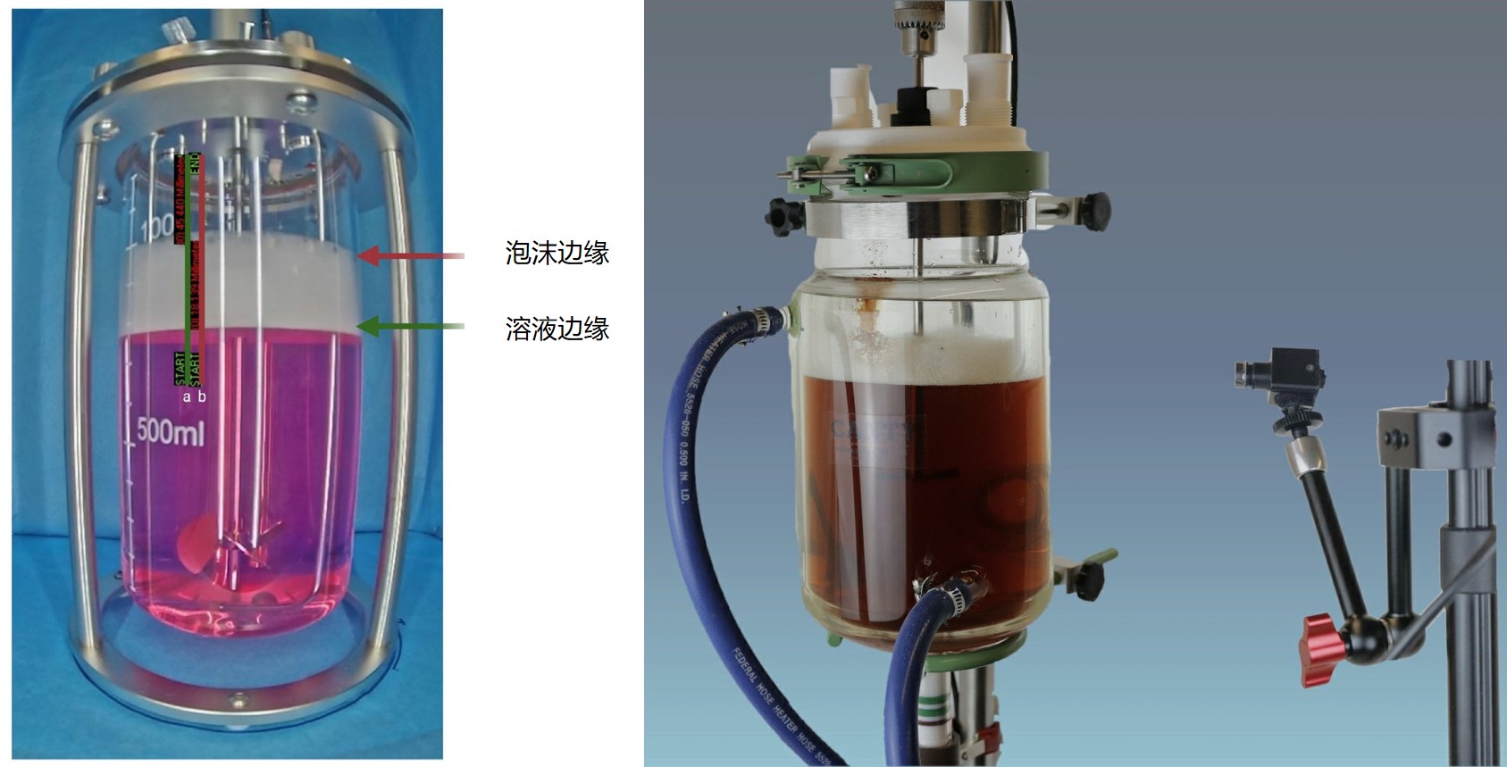Canty LabCam™过程监控系统可用于哺乳动物细胞培养中泡沫生成的测量与控制(下图),实现哺乳动物细胞培养工艺的连续监测与泡沫控制。左图展示了生物反应器产生泡沫后的摄像系统图像,LabCam 能精准识别泡沫与液面的边缘,进而对泡沫量进行连续测量。通过 Canty 软件在图像中标记并叠加的绿色和红色刻度,可测量特定时间间隔起始与结束时的液位及泡沫量。