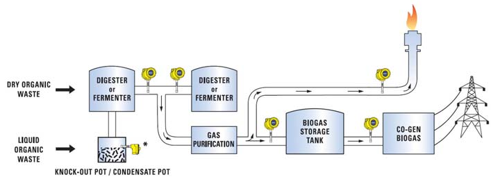 食品加工和屠宰场产生的有机工业废料、餐饮业和家庭食物垃圾、家畜产生的肥料,以 及能源作物,可以在反应罐(又称发酵塔)中进行厌氧消化处理。这一生物量消化过程 产生的气体被称作生物气,是甲烷(CH4)、二氧化碳(CO2)、水蒸气和微量硫化氢。 整个过程包括气体的生成、净化、储存(以罐体或气囊储存),并最终作为供热或发电 的燃料。地面火炬是整个过程的安全系统中的一部分。在系统中的几个点上测量生物气 流量,可以为操作者提供优化气体产量、控制、安全和报告所需的重要信息。