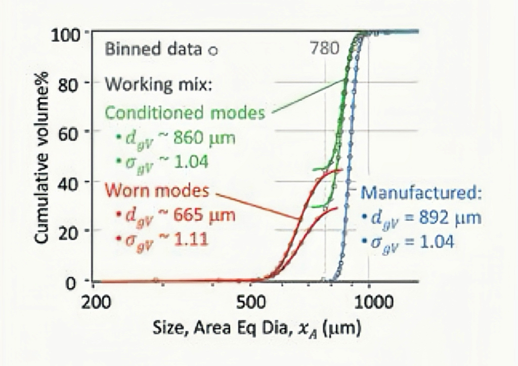 SolidSizer绘制的CW32介质粒度分布,清晰区分已修整(>780μm)与磨损(<780μm)颗粒范围,为介质状态判断提供直观依据