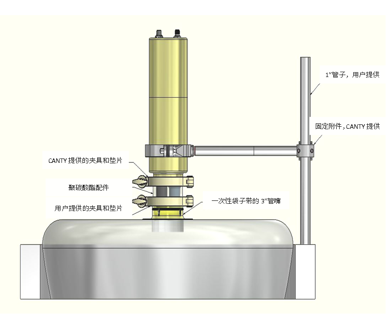 均采用镀镍铝制结构,NEMA 4x 防护等级 3” Tri-Clamp过程连接和1个一次性接头 旋转支架方便配合一次性袋子旋转操作/处理 |